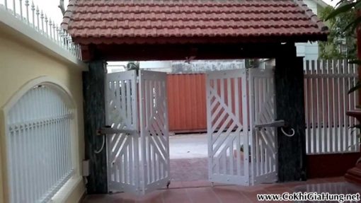Hạng mục thi công bao gồm: cửa cổng sắt pano, hàng rào song sắt kiểu giả gỗ và mái ngói phía trên cửa cổng.